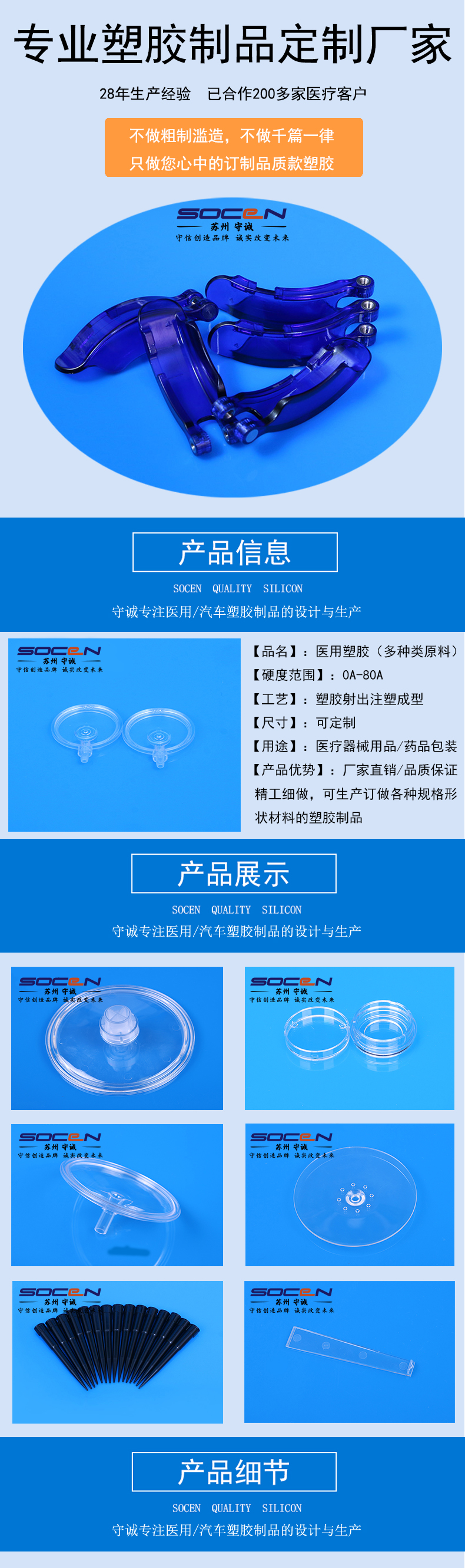 【产品名称】:PP塑料包胶【产品材质】:医疗级PP塑料(有相关生物相容性报告)【生产工艺】:注塑成型【产品颜色】:透明/可定制【生产环境】:600平十万级无尘车间,有相关无尘车间报告【资质认证】:ISO9001/ISO13485认证【产品包装】:双层PE袋包装出货 苏州守诚是一家专业塑料制品配件的生产